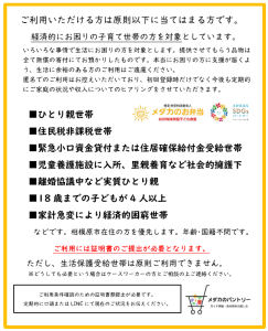 経済的にお困りの子育て世帯を対象としています。単身世帯、高齢者の方は対象外です。